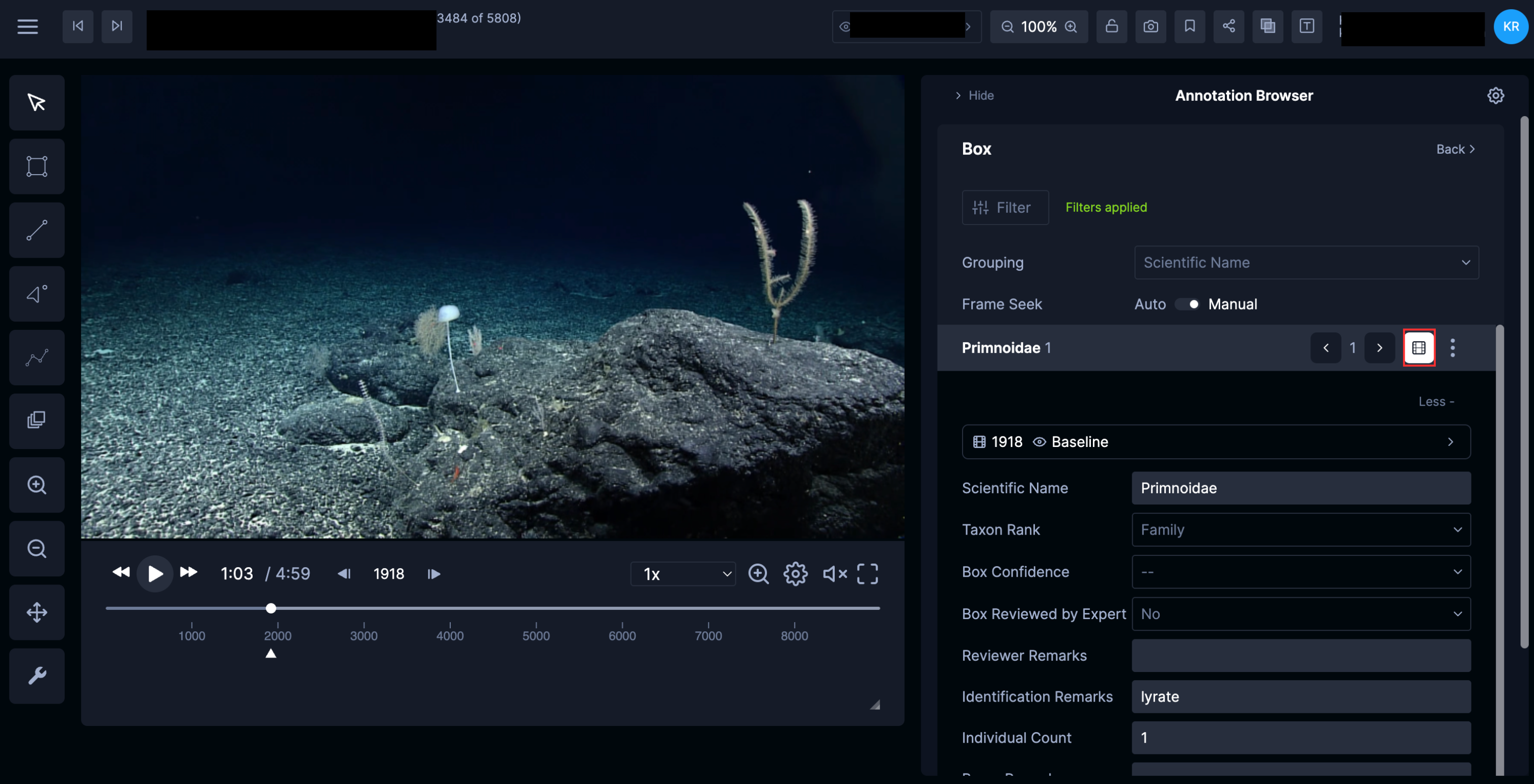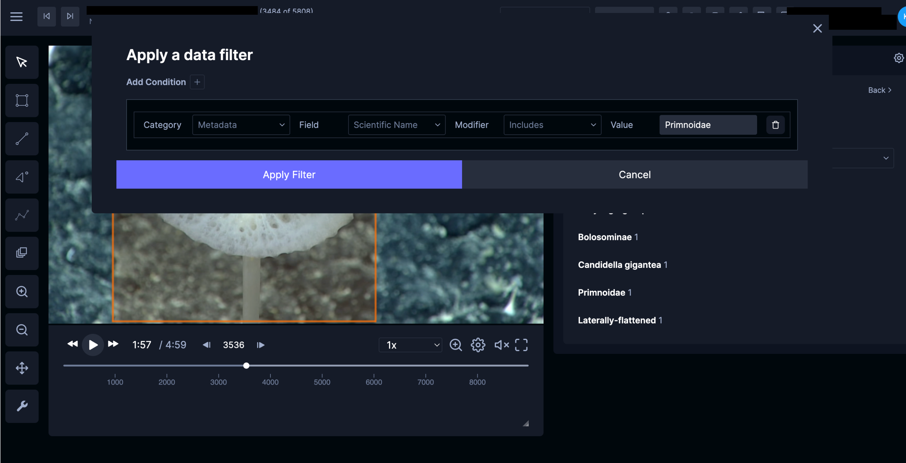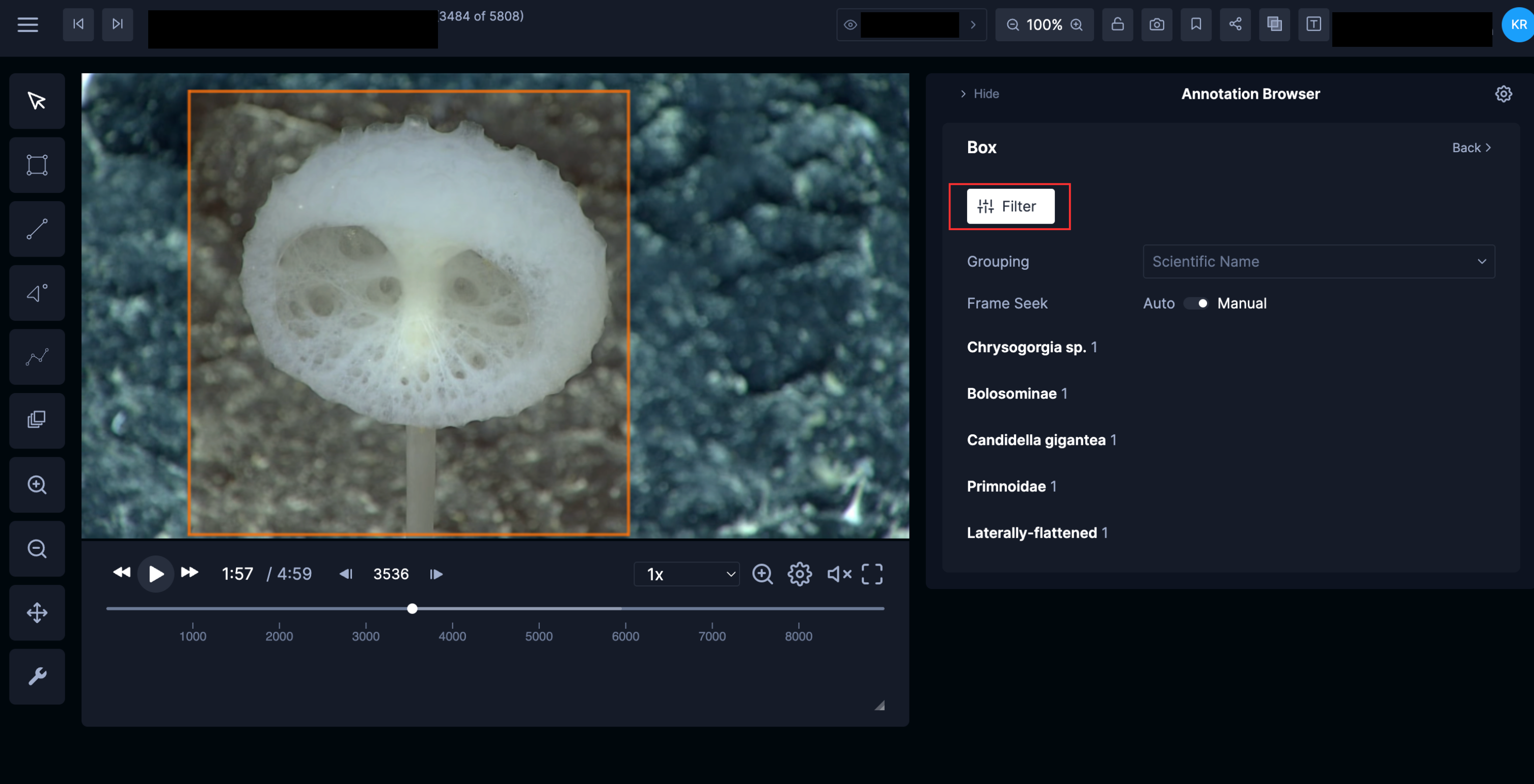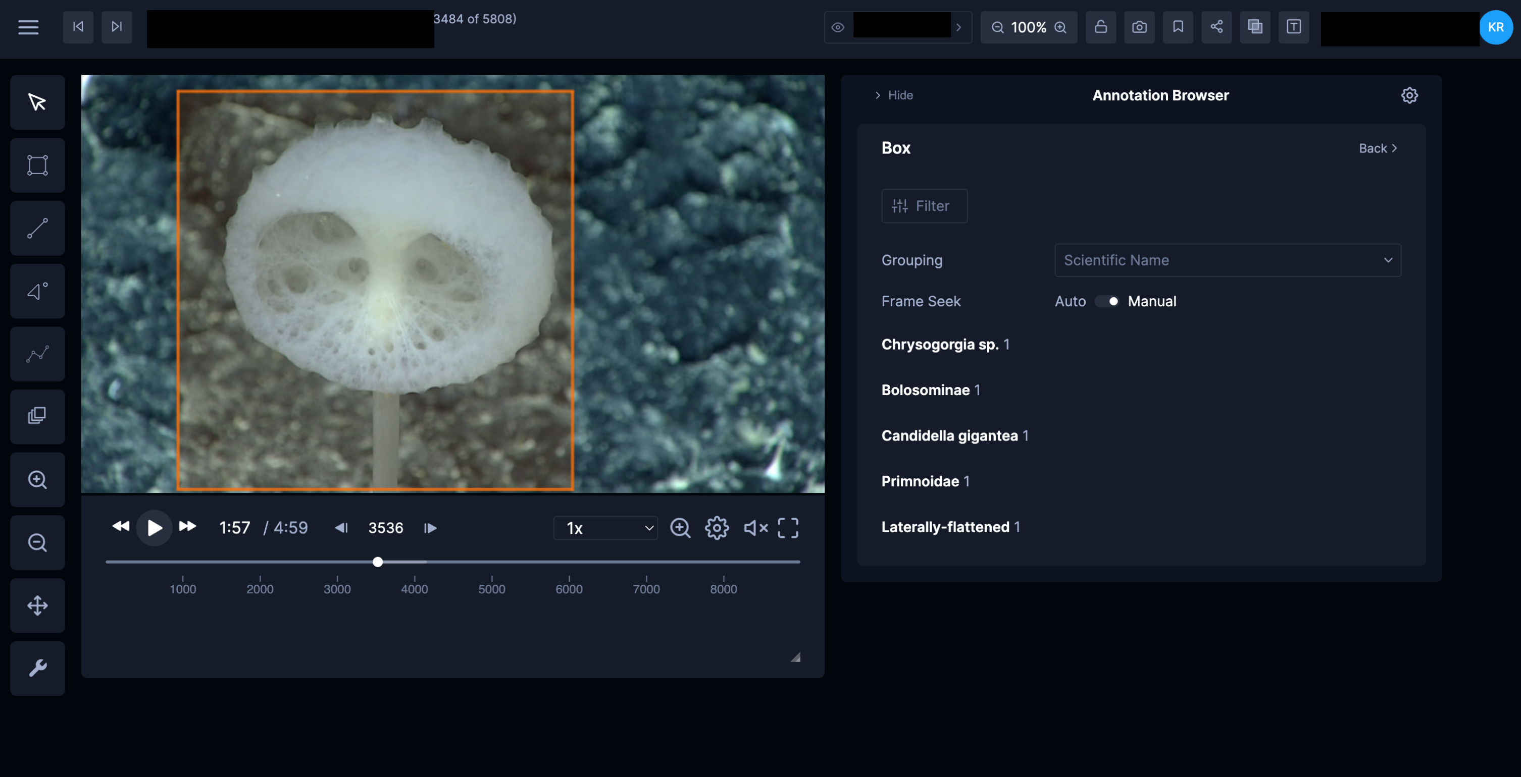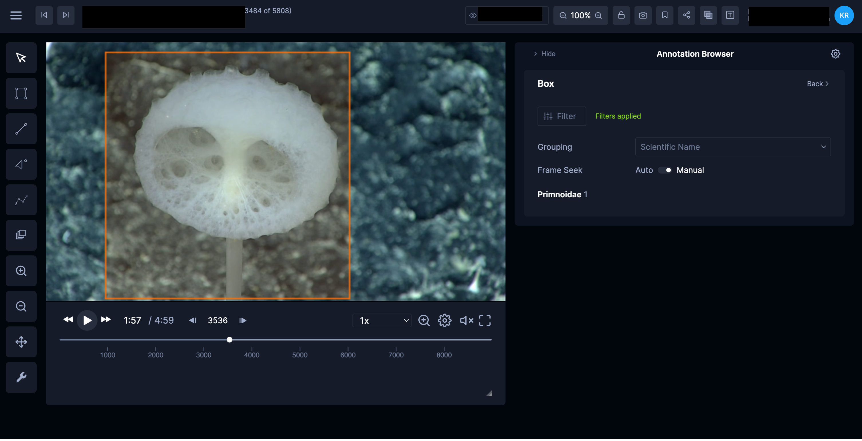 Tator provides a search interface for annotations in the annotation view. This facilitates use cases such as analyzing algorithm performance or filtering down to a particular class of interest. It uses Lucene query syntax, which is the string query syntax used by Elasticsearch. This tutorial will show you how to use it to filter annotations in the annotation view.